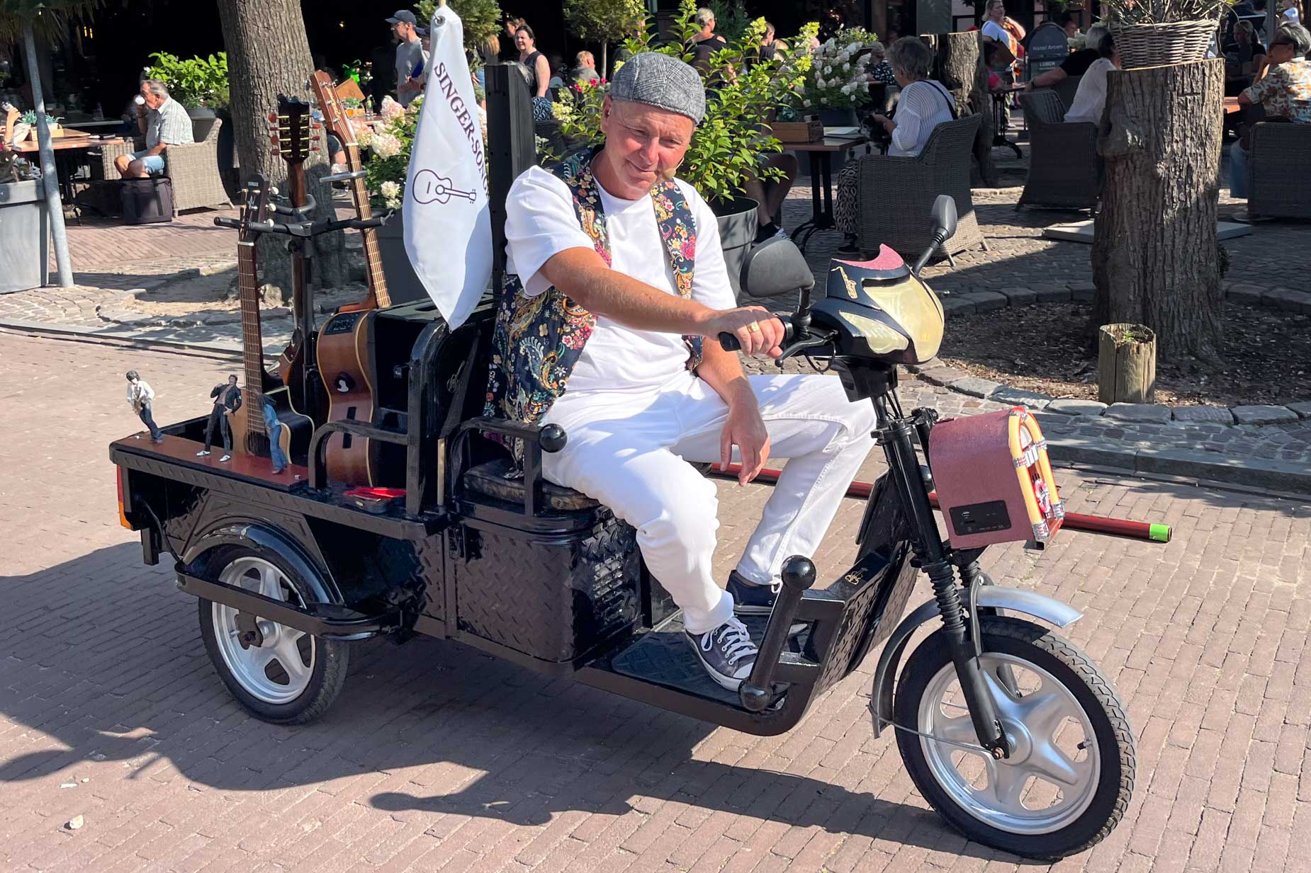 Deze elektrisch aangedreven tuktuk is omgebouwd tot een rijdende muzikale attractie. In de achterbak staan alle gitaren klaar voor gebruik en op de zijkanten zijn allerlei muziekiconen van popsterren geplaatst. Het karretje heeft een bijzonder coole uitstraling. Heel langzaam rijd de muzikant tussen het publiek door met allerlei gezellige leuke liedjes waar mensen een fijn gevoel van krijgen.